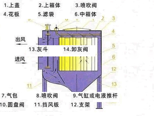 反吹(吸)風系統包括反吹(吸)風機、反吹(吸)風管、氣缸、電磁閥、測壓裝置、閥板及壓縮空氣管路等。